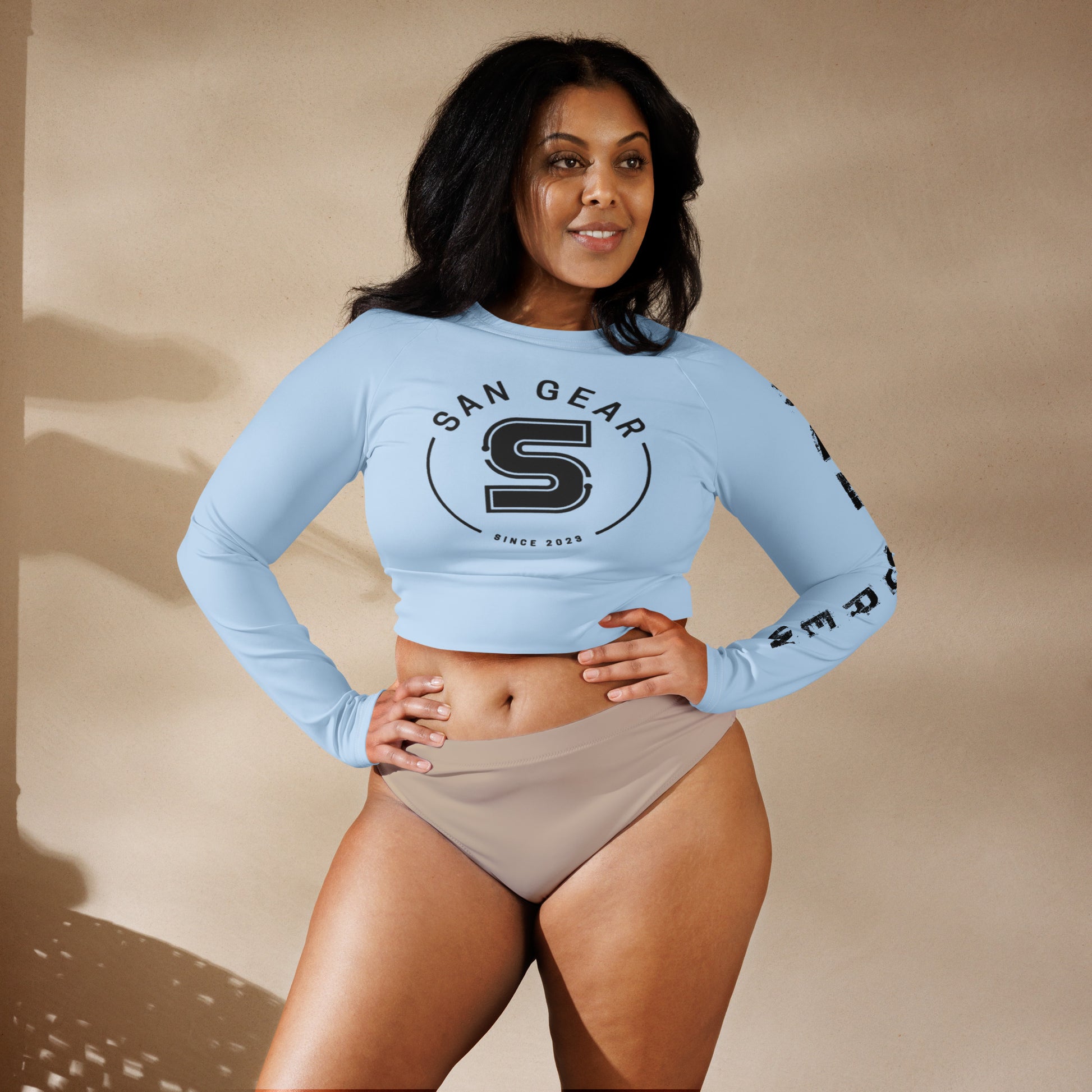 Ce haut court à manches longues est fabriqué en polyester recyclé et en élasthanne, faisant de lui un choix écologique pour la natation, le sport ou les tenues de sport. Le haut court est doté d'une étiquette d'entretien détachable et d'une large ceinture à double épaisseur pour une coupe confortable.